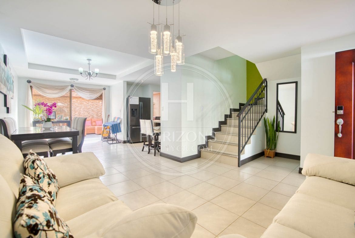 Esta propiedad de dos niveles cuenta con una distribución funcional y acabados en excelente estado. En el primer nivel se encuentra la zona social con sala, comedor y cocina integrados en un espacio abierto, además de una terraza posterior con excelente iluminación natural. En el segundo nivel se distribuyen tres habitaciones y dos baños completos. La propiedad se entrega impecable, con pisos de cerámica, cortinas y lámparas incluidas.